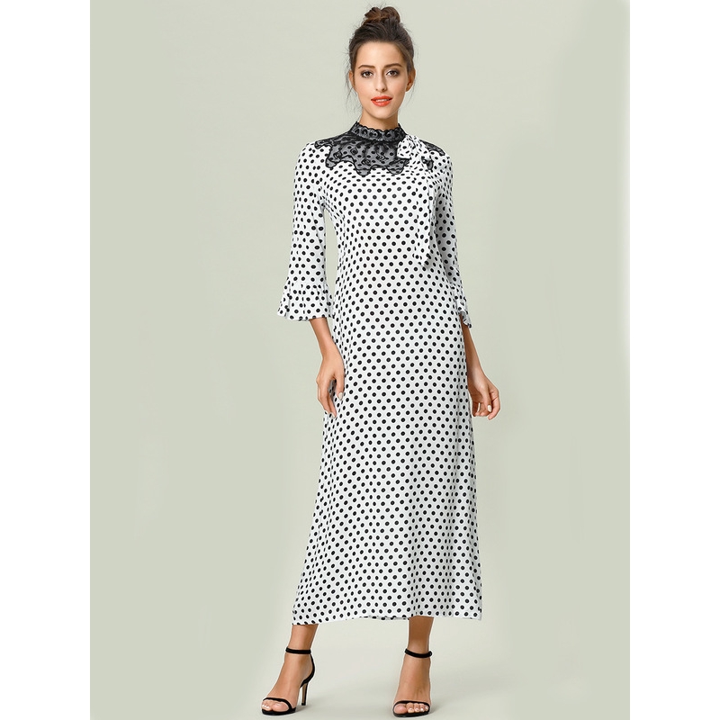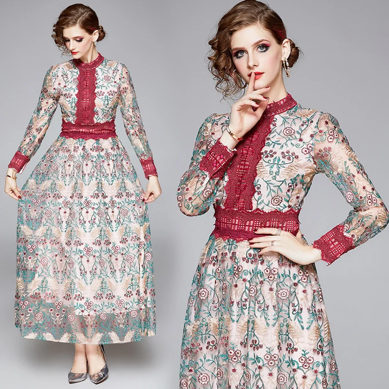 2020 Baru Mesh Bordir Gaun Panjang Renda Jahitan Retro Wanita