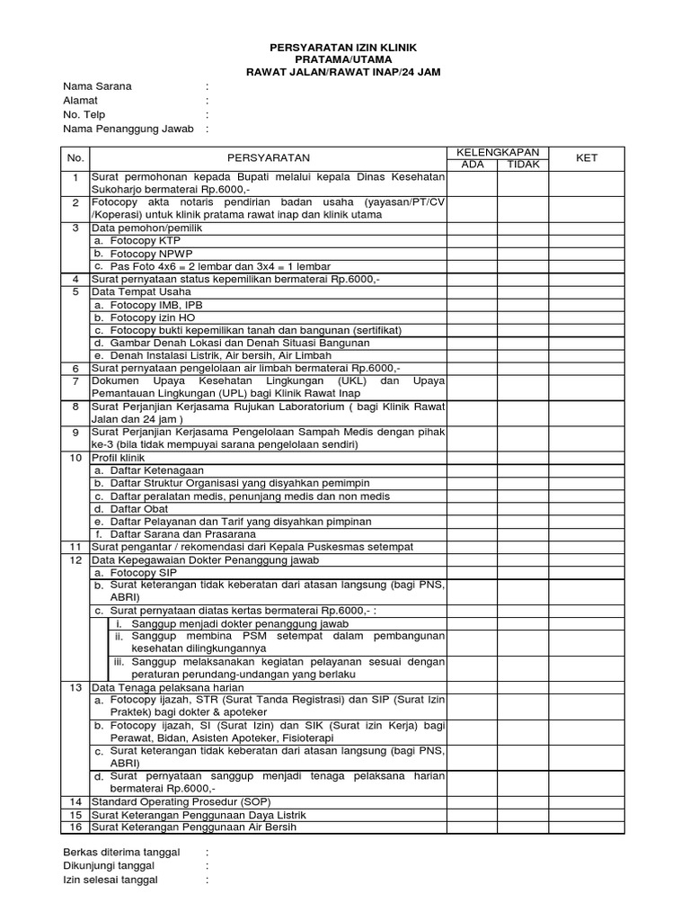 Persyaratan Izin Klinik Pratama Utama Rawat