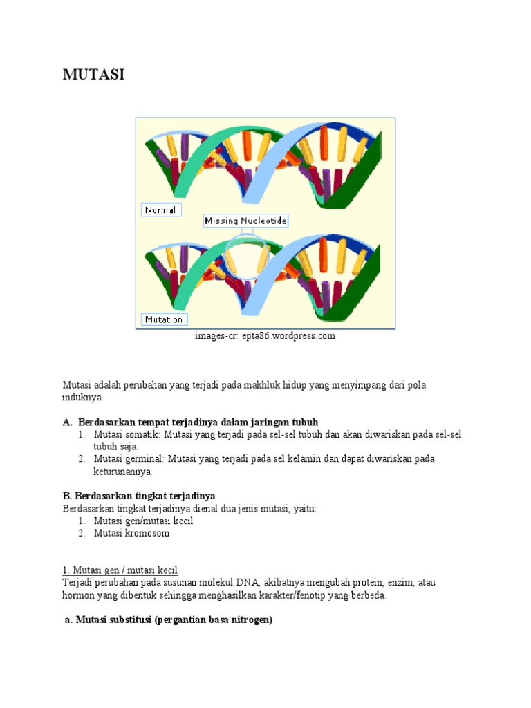 Pengaruh mutasi gen dapat terlihat atau tidak terlihat. Peristiwa yang terjadi pada mutasi gen adalah perubahan urutan basa nitrogen dna. Mutasi ini terjadi akibat adanya perubahan pada satu pasang dna pada suatu gen. Mutasi adalah perubahan yang terjadi pada bahan genetik dna maupun rna baik pada taraf urutan gen maupun pada taraf kromosom mutasi pada tingkat kromosom disebut aberasi.