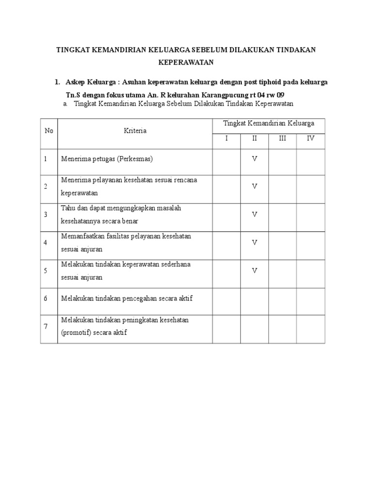 Tingkat Kemandirian Keluarga Sebelum Dilakukan Tindakan